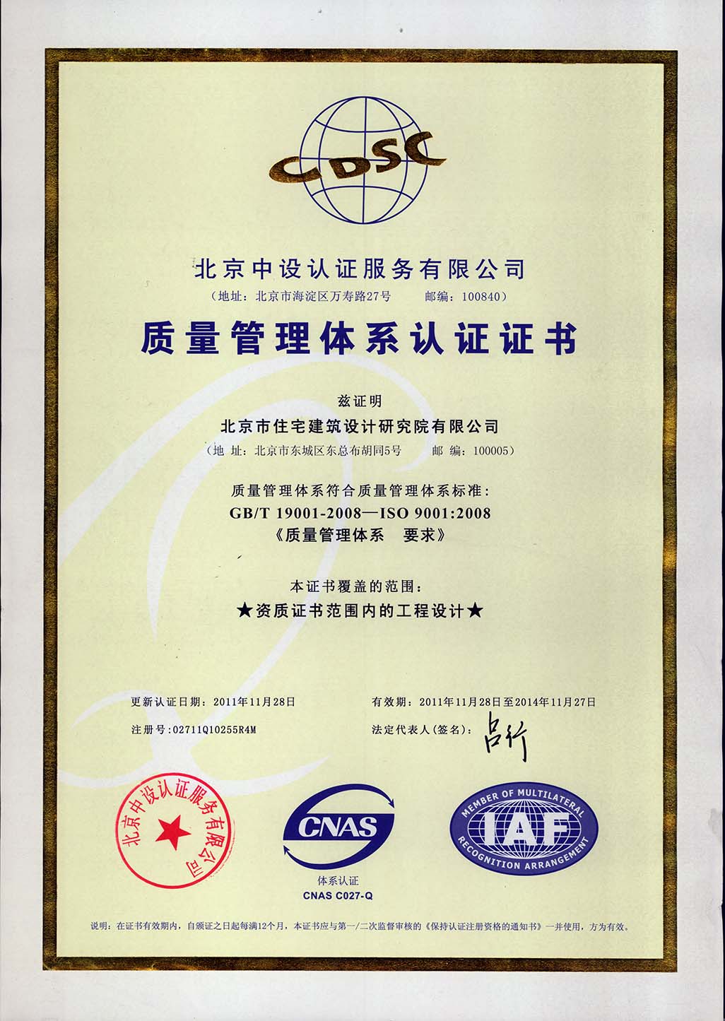 2000年正式取得ISO9001:1994標準質(zhì)量管理體系認證,成為北京市甲級設(shè)計院第八家認證單位。